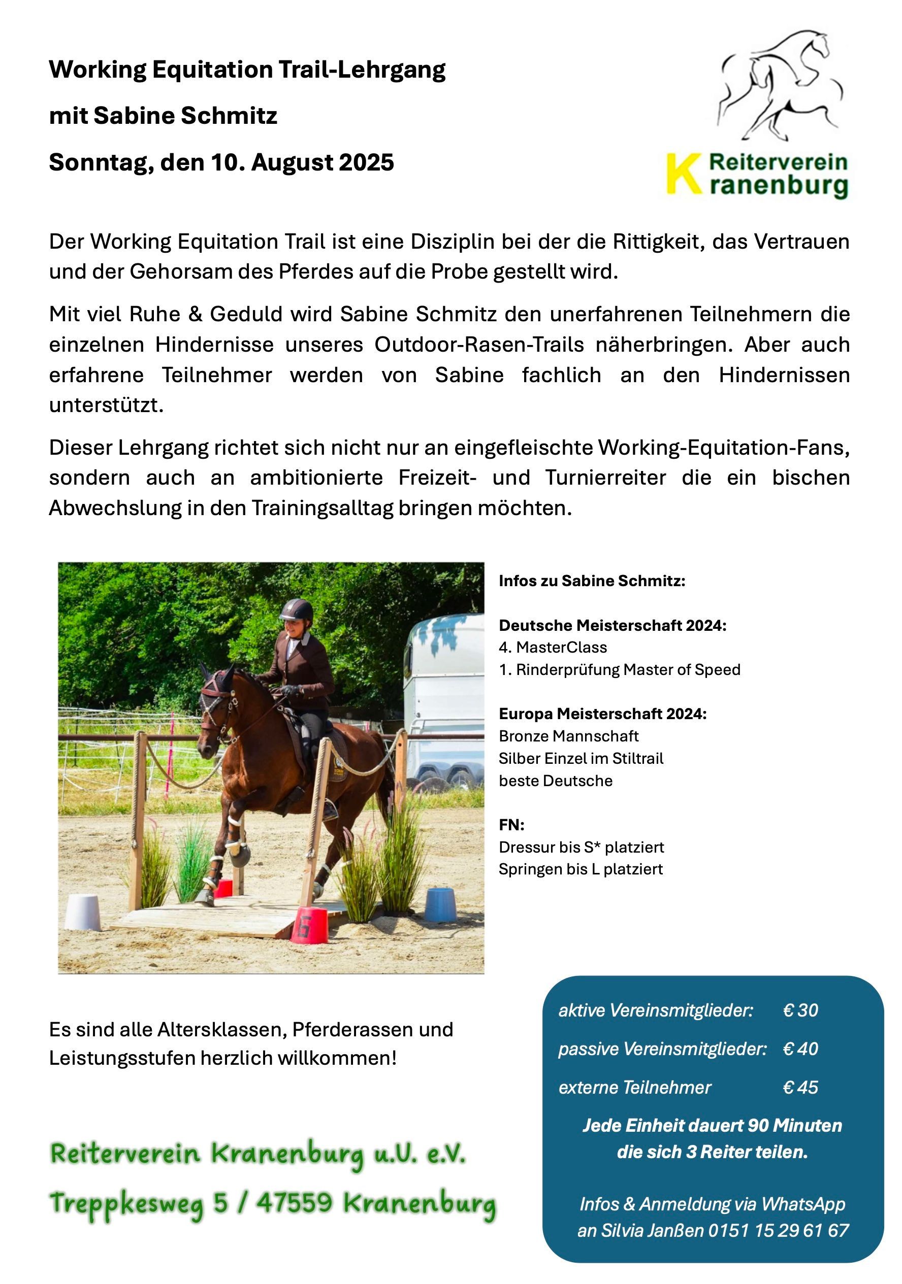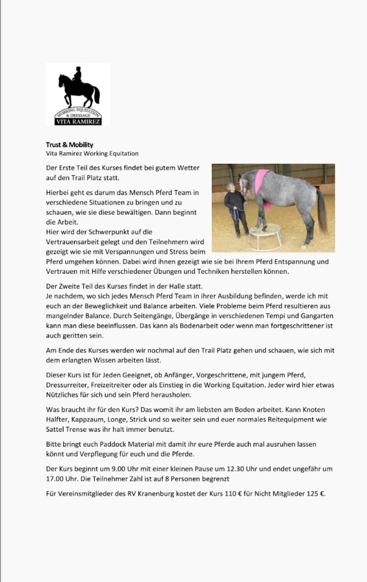 Schön, dass Du den Weg zu uns gefunden hast und mit Deinem Pferd etwas Neues ausprobieren möchtest! Seit dem Frühjahr 2025 sind wir dabei einen Trailparcours für unsere Mitglieder, aber auch für Menschen wie Dich zu bauen. In unserem Trailparcours sind Elemente aus der Vielseitigkeit und Working Equitation zu finden, aber auch weitere, spannende Hindernisse, wie eine Wellenbahn, Plane oder Wippe. Durch die Nutzung des Trailparcours bringst Du Abwechselung in das Training mit Deinem Pferd, begibst Dich in neue Situationen und lernst diese mit Deinem Pferd zu bewältigen. Außerdem haben die Hindernisse einen positiven Einfluss auf Gleichgewicht, Balance und Koordination. Der Trailparcous befindet sich zurzeit noch im Aufbau und wird in der kommenden Zeit verändert und ergänzt. Dementsprechend können in Zukunft die Preise angepasst werden.